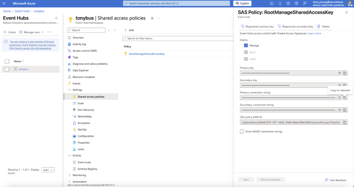 Choose your desired Access Policy and click its name in the list. Click the Copy to Clipboard button next to the Primary connection string field