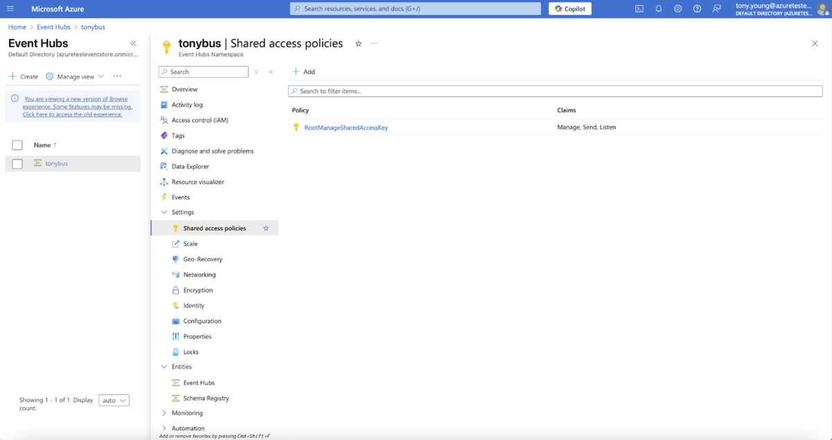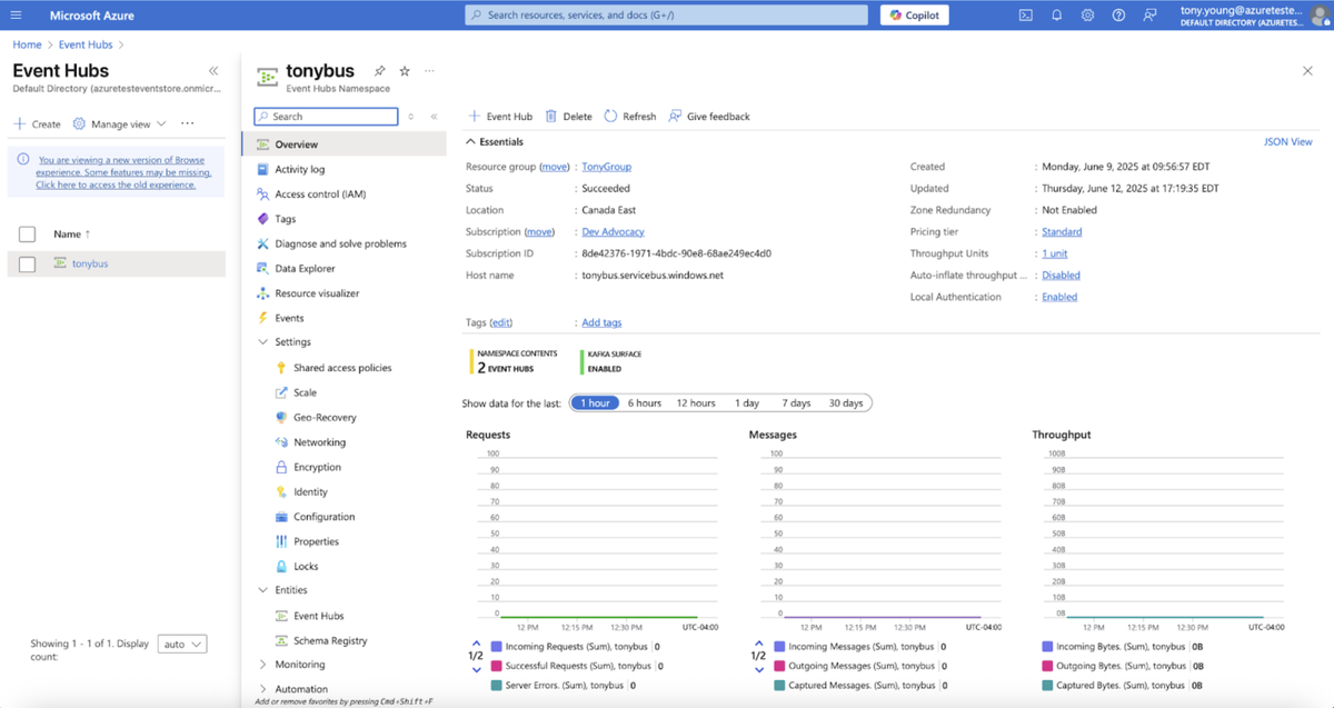 Many customers desire to send events from KurrentDB to Azure Event Hubs for dissemination to downstream applications and technologies. Since Azure Event Hubs provides a Kafka endpoint, integration with KurrentDB can easily be configured using our Kafka Connector Sink. This document outlines the steps necessary, and where to find the required information in the Azure control panel